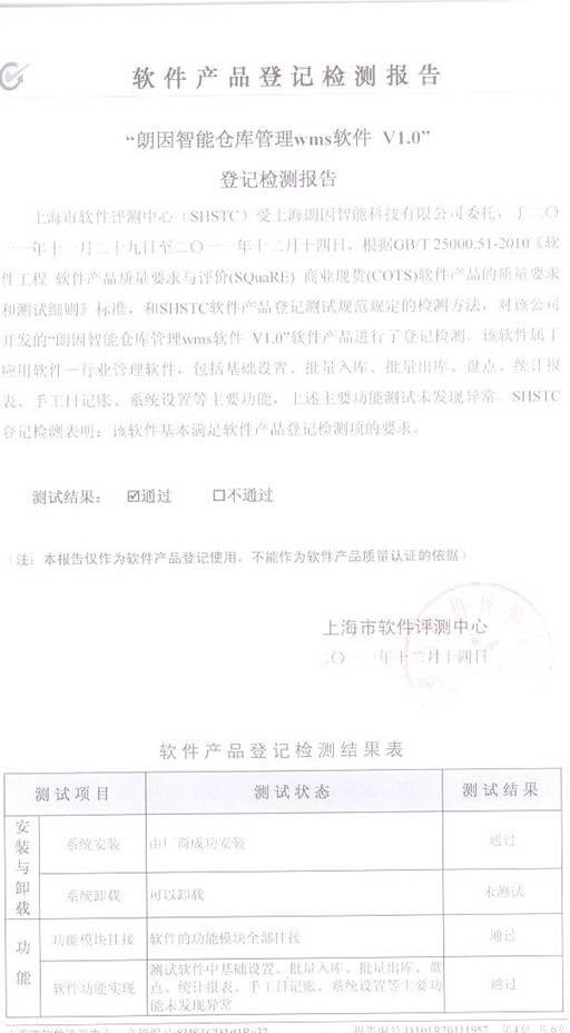 热烈庆祝上海朗因智能_仓库管理WMS_软件 通过上海市软件评测中心测试。